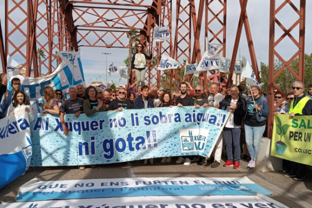 Gent de tota la Ribera i altres poblacions es concentren al pont de Ferro d'Alzira advertint que al riu Xúquer "no li sobra aigua"